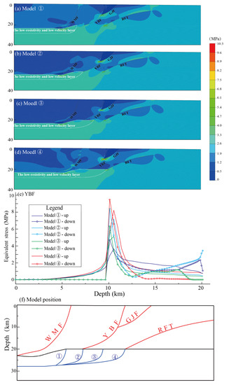 Due to the steep altitude characteristics of LMS, the existing methods cannot obtain the high-resolution underground structure of this area, so the frontal edge position of the detachment layer has always been the focus of controversy [11,14,15,16,17,18]. The simulation results above show that the detachment layer need to extend eastward beyond the WMF in LMS, only in this way, accumulated stress generated in the pushing process of upper crust be transferred to YBF and the fault on the east side instead of WMF. This paper analyzes the effect of the frontal edge position of the detachment layer, as shown in Figure 8f, four cases are discussed: case (1) the frontal edge of the detachment layer only reaches the position of steep slope, about 7 km west of YBF; case (2) the frontal edge of the detachment layer intersect with YBF; case (3) the frontal edge of the detachment layer lies in the middle of YBF and RFT; case (4) the frontal edge of the detachment layer intersect with RFT (Model 4 in this paper).