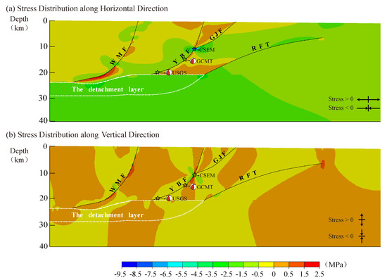 After the Wenchuan earthquake, there was a constant controversy over the source parameter of the earthquake, especially the depth of the earthquake. We collected the focal depth of Wenchuan earthquake from 7 organizations, the depth range from 10 km to 20 km (Table 2), and most of which are concentrated in 10–14 km (five out of seven). The seismogenic fault and depth of the earthquake can be well explained by the Model 4 in the paper. In order to discuss the rupture mechanism of two faults caused by Wenchuan earthquake, we display the distribution of equivalent stress accumulation along the horizontal and vertical directions in Model 4. Figure 9a shows the stress distribution along the horizontal direction. When the stress is greater than zero, it represents the tension along the horizontal direction; when the stress is less than zero, it represents the pressure along the horizontal direction. Figure 9b shows the stress distribution along the vertical direction, and the direction represented by the stress magnitude is consistent with the horizontal stress. In this paper, we collect three representative focal depths (the focal depth of CSEM, GCMT and USGS, pentagrams in Figure 9a,b) and project them on the YBF, and we also collect the focal mechanism solutions provided by GCMT and USGS and mark them on the side. The stress accumulation is most prominent between the focal depths provided by CSEM and GCMT, Figure 9a shows that in the horizontal direction, the area at the bottom of the intersection of YBF and GJF is mainly compressed in the horizontal direction, with the maximum value of −9.5 MPa; while in the vertical direction (Figure 9b), it is mainly tensile stress, which is distributed on the hanging wall of YBF above 10 km and the footwall of YBF below 10–12 km, with the maximum value of 2.5 MPa. We can infer that the fault combination mode of YBF and GJF is firstly affected by the eastward pushing of Bayan Har block, resulting in a large horizontal compressive stress, while the listric-reverse structure of YBF will produce tension stress on the hanging wall of YBF during the thrusting process of LMS. Once the stress accumulation exceeds the strength of the rock itself, the rock in this area will be weakened. At the same time, the continuous increase of the vertical stress (i.e., shear stress) will lead to the rupture of the weakened rock along the fault direction, which will eventually lead to the Wenchuan earthquake. Once the rupture occurs, the vertical tensile stress will first make the rupture upward along YBF, at the same time, we also notice that the hanging wall of the GJF is mainly a tensile deformation area along the horizontal and vertical direction, and the rupture at the bottom will transfer to GJF easily, which causes the simultaneous rupture of two faults.