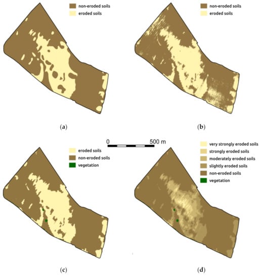 The pixel-based classification of high-resolution images is a very simple and quick approach but produces scattered patterns, which are less suitable for practical use (Figure 2b). Similarly, to visual interpretation, this method is not suitable for distinguishing more than two classes (eroded and non-eroded soils) because more classes would markedly increase the scatter of the resulting patterns.