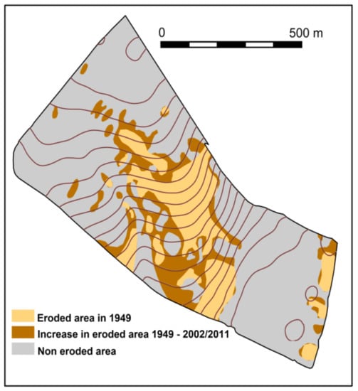 The resulting map (Figure 3) showed that, in 1949, the acreage of strongly-eroded soils reached 10 ha, while in 2011, it was 17.6 ha, which means the eroded area increased by 76%. This significant increase is likely attributable to changed land-use structure and the introduction of mechanized agriculture. The merged large fields have a longer slope. The heavy machinery has increased the ploughing depth and speed, encouraging tillage erosion.