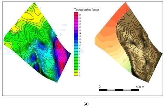 In the central part of the ridge occurring in the studied area, the isoline field of the LS factor roughly follows the erosion patterns (Figure 4a). A belt of less-eroded soils indicates the structure of the isoline field on the western slope. Also, for this factor, similarly to the ED’ index, it is difficult to explain the occurrence of sharp singularities in the eastern part of the analysed area. However, a singularity should not be the area of the most strongly-eroded soils, but the area of maximal flow velocity (maximal gradient or slope angle). It is a consequence of the similarity between the structure of isoline field of the LS factor and the isoline field of the gradient magnitude or slope angle (exponent m = 0.5 in Equation (3) reduces the effect of increased slope length and slope angle has major control over the LS value). The pattern of the more complex erosion/deposition index ED’ is similar to the LS factor pattern. A comparison of the isoline field of erosion/deposition index ED’ with the erosion pattern (Figure 4b) shows that the most prominent differences exist in the central and lowest parts of the central periglacial valley (values of the contributing area are the highest in the valley). The causality between soil loss and topographic indexes of selected water erosion models was not sufficiently demonstrated (see the summary output of the linear regression in Table 3).