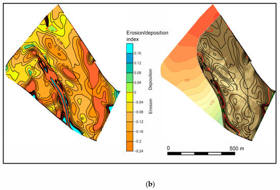 All the erosion factors, except for relief, were quasi-uniform at the study site, and for the calculation of the sediment flow map, the factors R = K = C = P = 1 and exponents m = n = 1 were used. Exponent values close to 1 best reflect the long-term impact of both rill and sheet erosion. Then, the sediment flow T, given by Equation (4), is equal to the topographic component of the water erosion potential EP, given by Equation (2), and the erosion/deposition index ED’ can be calculated by the following Equation (6):