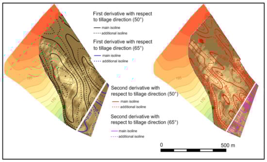 Also, the impact of tillage erosion on the overall soil loss or accumulation should be considered. The net flux due to tillage translocation after alternating up-or down-slope tillage operations is proportional to the slope gradient (tangent of slope angle). Assuming that tillage erosion can be modelled as a diffusion process, temporal change of altitude, i.e., redistribution of the soil mass, is then proportional to the slope gradient change [50]. Let us consider the elevation profile in the arbitrary tillage direction. The slope of the line tangent to the elevation profile at the given point is proportional to the first-order directional derivative of elevation with respect to the direction of tillage. The change of slope at the given point is proportional to the second-order directional derivative.