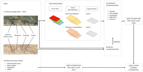 In Europe, historical reconstructions of the changes in the land over the last 300 hundred years provide information of a period when major transformations occurred due to agriculture, grazing activities, and the growth of urban settlements [1,2]. The monitoring of land change defined as an integration of land use and land cover, allows to identify and describe the underlying processes and factors that contribute to shape this arrangement [3,4,5].