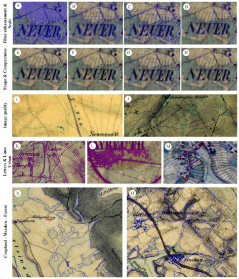 Classification results: (A) quadtree segmentation, Scale: 60, no filter; (B) quadtree segmentation, Scale 60, Frost Filter; (C) quadtree segmentation, Scale 100, no filter; (D) quadtree segmentation, Scale 100, Frost Filter; (E) multi-resolution segmentation, Shape: 0.1, Compactness: 0.9, Scale: 10; (F) multi-resolution segmentation, Shape: 0.1, Compactness: 0.9, Scale: 20; (G) multi-resolution segmentation, Shape: 0.5, Compactness: 0.8, Scale: 10; (H) multi-resolution segmentation, Shape: 0.5, Compactness: 0.8, Scale: 20; (I) image with faded colors or bleached where Meadow intersects cropland fields and the lines identify the final classification objects; (J) image with low contrast among classes where there are blue shades of rivers intersecting the forest, which are difficult to distinguish; (K) letters & lines and urban are colored purple and intersect cropland and meadow objects; (L) dark objects such as stains are misclassified as letters & lines on the basis of their layer values; (M) urban objects (little red and black squares) usually overlap letters & lines, hampering discrimination; (N) subset of image (PB078) classified: meadow, cropland and forest are visible (Overall Accuracy: 0.81, Overall Kappa: 0.71); and (O) subset of image (PB158) classified: meadow, cropland, urban and forest are visible (Overall Accuracy: 0.98, Overall Kappa: 0.96).