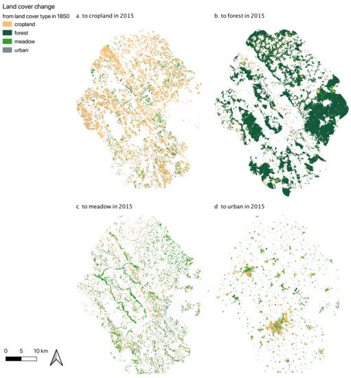 The analysis of land cover change was done for the watershed of the Rivers Red and White Main, because this allows using the results in further assessments of ecosystem services (e.g., erosion regulation, timber production, and crop production). Here, water bodies and other land cover were excluded from the analysis, because they sum up together only to 0.8 percent in current time and could not be classified on historical maps, because of technical difficulties. Overall, there was a strong increase in urban area by 2600% from 0.3% to 8.8% of the landscape, a severe loss of cropland (−24%), and a moderate one of meadows (−4%), as well as a slight gain in forests (+4%) (Table 4 and Figure S2). Cropland shows overall strong persistence; only some meadows and forests were turned into this land cover (Figure 4a). Similarly, forests generally show strong persistence, but former cropland and meadows were transformed into forests in more mountain areas in the Franconian Forests, Franconian Switzerland, and Fichtel Mountains (Figure 4b). Meadows show a moderate persistence and partly origin from cropland and less from forests (Figure 4c). Urban land in 2015 was mainly built on cropland and meadows of the 19th century (Figure 4d). Table 5 quantifies the spatially explicit change shown in Figure 4, i.e., how much land of a current land cover type was in the past in cropland, meadow, forest, or urban cover.