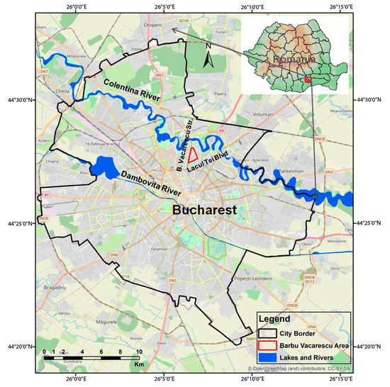 Bucharest map. Barbu Vacarescu Area is outlined in red. Map generated in Esri®ArcMap™ 10.3. Base map source: OpenStreetMap.