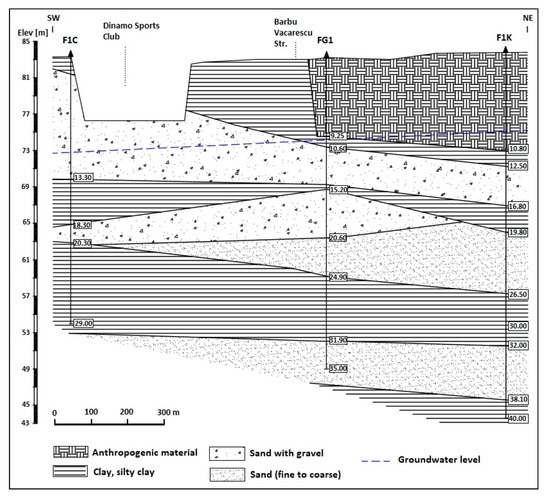 The geological stratification mapped in the construction site is in accordance with the geological model (Figure 9). Hence, the top layer is an anthropogenic material layer with thicknesses of approximately 9 m. The anthropogenic material is a mixture of silts, clay, silty clay, biodegradable waste, and demolition waste. This urban soil stratum is very compressible and has weak shear-strength parameters [63]. The mechanical properties of this anthropogenic layer induce a difficult process of building foundation development. This stratum is very sensitive to static and especially to dynamic conditions (e.g., vibrations, earthquakes). The anthropogenic material stratum lays on a macro granular alluvium package consisting of sand and gravel [63].