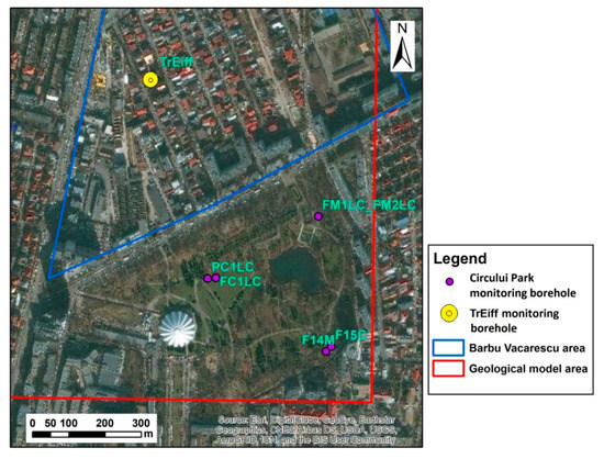 Hydraulic head time series were available for the Circului Park green area. The series include data corresponding to the monitoring boreholes for both shallow aquifer and middle aquifer strata. Table 2 mentions these boreholes and the corresponding monitored aquifer strata. Figure 6 illustrates the location of the monitoring boreholes in the study area. The hydraulic-head measurements cover the time period February 2013 to July 2019. A large dataset was available for 2015 by means of 15 measurement campaigns that were conducted during the entire year. All these boreholes are part of the Urban Groundwater Monitoring System (UGMS) of Bucharest city [31].