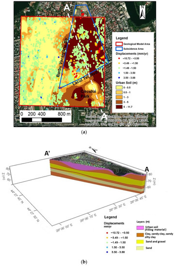 The Barbu Vacarescu area: (a) The thickness of the anthropogenic layer and the corresponding PS points. The geological cross-section is indicated along profile AA’ crossing the Barbu Vacarescu area and Circului Park from SE to NW. Map generated in Esri®ArcMap™ 10.3. Base map source: ESRI World Imagery; (b) geological model following geological cross-section AA’ giving the lithological strata of the subsurface.