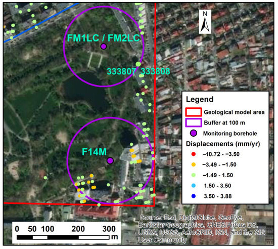 For the F14M monitoring borehole, the analysis was made for the middle-confined aquifer strata, as more than 60 PS points are within the 100 m buffer zone. The selected PS points can be seen in Figure 12.