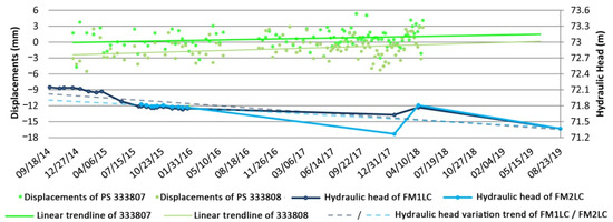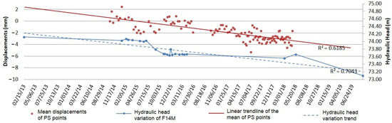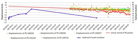 Analysis of the combined datasets hydraulic head and the PS points time series is shown in Figure 15. As it can be observed, the relationship between displacements and hydraulic head variations is based on limited measurements, however the area hydraulic head evolution follows the general decreasing trend for the period 2006–2015, modeled and illustrated in Figure 3 [37]. The modeled aquifer hydraulic head decreasing trend is confirmed by the area wells as well as by the measurement took in TrEiff borehole on May 2016.