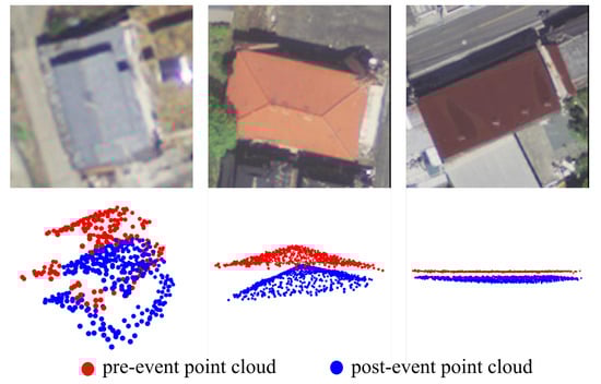 Airborne light detection and ranging (LiDAR) systems are capable of rapidly obtaining position and precise elevation information in the form of 3D point cloud data. These systems can operate under most weather conditions by using the active sensing principle, making them an attractive choice for building damage detection. As can be observed in Figure 1, the obtained point cloud can successfully capture the deformations of buildings, which are hardly visible in vertical aerial images. Therefore, LiDAR technology has greater potential, being able to obtain more precise height information than vertical images, to detect severely damaged (e.g., story-collapsed) buildings. Similar to image-based methods, multi-temporal change detection [13], as well as single-temporal approaches [14] have been used to assess building damage using LiDAR point clouds. As buildings are often represented by roofs (the other parts are normally not visible or partially visible for lower residential buildings) in airborne LiDAR point cloud data, a large number of methods have been proposed to detect surface and structural damages represented by roofs. For instance, region-growing-based methods are proposed to detect the planes by segmenting 2.5D raster data and subsequently classified by comparing post-event data with pre-event wireframe reference building models [15,16]. However, these approaches require multiple parameter-sensitive algorithms for detecting planes and roofs, which make them time-consuming to generate optimal results. Furthermore, the constant values of parameters in segmentation process are vulnerable to non-uniform density and data corruption. Structural damages such as roof inclinations can be reliably detected by calculating angle between geometric axis of roofs and vertical planes [17]. However, the method put strong assumptions on the type of building roofs, and hence this type of method is not suitable for large areas with varying roof types. Some approaches utilize radiometric information of (oblique) images to assist the building damage detection in the 3D domain [18,19]. Nevertheless, oblique image-based approaches are difficult to adapt to dense residential areas with low-height buildings because of the large numbers of occlusions. Moreover, rich radiometric information from images is not always available to assist 3D building damage detection.
