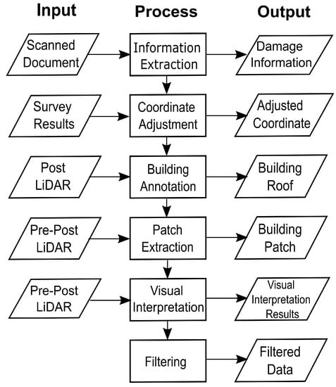 As shown in the Figure 3, the first step to create the dataset was to extract the damage information. Damage grades and descriptions, as well as the collapse type were collected during field surveys using recording sheets. Simplified recording sheet is shown in Figure 4. The original recording sheet made by the Cabinet Office of Japan is available online [37]. These recording sheets were digitized by investigators and stored with photographs taken during the surveys. In order to extract damage information from scanned documents, we manually extracted the damage grades from the scanned recording sheets. Damage grades were tied with unique building IDs, in order to provide ground truth labels to each building point cloud to be annotated in the following steps.