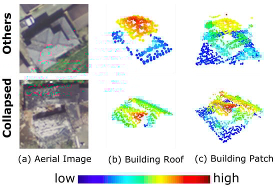 The adjusted coordinates were used to locate the corresponding buildings in post-event LiDAR point clouds. Specifically, for each coordinate, we used it as the center and extracted all points within a 10 m square window (with infinite elevation) out of the whole point clouds to visualize using Python PPTK library. Then, the building part of the point clouds was annotated manually and stored in the NumPy Array format. The boundary ambiguities were resolved by visually assessing backscattered intensities, in situ photos, and Google Earth historical images. Note that the buildings were observed by airborne sensors, and thus, the information of structures below roofs was extremely limited. Furthermore, the debris of “collapsed” buildings were excluded, in order to minimize possible incorrect annotations. In the case of fully “collapsed” buildings, we observed that their roof remained either structurally intact or partially deformed, and thus, their roofs were also annotated. In other words, all of the extracted building data consisted of either structurally damaged roofs in the case of “collapsed” buildings or structurally intact roof for “others” buildings (these roofs may contain surface damage). The reasons for extracting roofs separately are three-fold: The separation of the roofs and surroundings is important for evaluating whether the models are able to classify the input point clouds correctly given only buildings (roofs) themselves. By training DNNs using only building roofs, how the DNNs recognize building damage can be made clearer through visual explanations. The effect of surroundings information could be quantified through comparing the performances of the models using either building roofs or building patches, which include both the buildings and surroundings, for training. For clarity, we call the annotated roofs “building roofs” in this study. The example of building roof is shown in Figure 5.