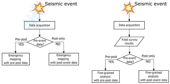 Overall damage detection framework of emergency mapping (left) and fine-grained analysis (right).
