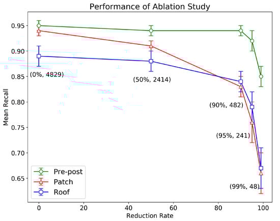 The results of the ablation study are shown in Figure 12. As expected, the performance using pre–post data was extremely robust to data reduction, achieving approximately 0.85 of mean recall with only 1% (48) of the training samples. This suggests that our proposed framework is effective for damage detection when both pre- and post-data are available. On the other hand, the performance and stability of both roof and patch decreased with increasing reduction rates. However, their performances were still acceptable (around 0.83) after removing 90% of the training data. The scores of the building roofs became higher than those of the building patches after a 10% reduction. Nonetheless, the scores of the roof were closely followed by those of the building patches, until they reached a reduction rate of 1%.