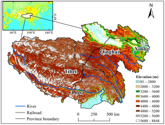 The QTP, consisting of Qinghai Province and the Tibet Autonomous Region, is the largest and highest mountainous region in the world, with an average elevation of over 4000 m above sea level (Figure 1). The QTP is characterized by low temperature and strong solar radiation and hosts the largest permafrost area in a high-altitude region worldwide. This complex topography and uniquely harsh climate of the QTP play important roles in the uneven human population distribution [30]. The QTP is a typical remote rural region in China, more than two-thirds of the QTP is covered by grassland. Compared with other areas of China, the level of urbanization of the QTP is low. Evidence indicates that humans had occupied this eastern plateau since the Middle Pleistocene epoch [31], however, the north part of the QTP is considered as one of the largest terrestrial wilderness areas in the world [32].