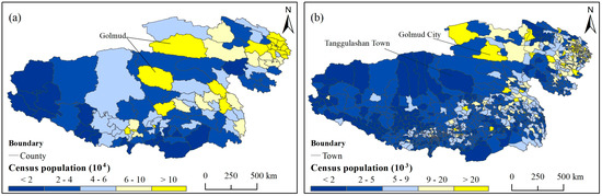 Maps of the census counts for the QTP at the county level (a) and the town-level (b) matched to their corresponding administrative units for 2010.