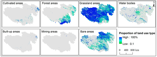 Land use/land cover data for the QTP were obtained from China’s land-use/cover datasets (CLUDs). The datasets have been identified as one of the highest accurate land use/land cover products at the national level for China [36]. These datasets have a spatial resolution of 30 m and provide a long time series from the late 1980s to 2015 at five-year intervals [36,37]. This study used the datasets for 2000, 2010, and 2015. The CLUDs are divided into six land use categories with 25 land use sub-categories. The six categories are cultivated land, forest land, grassland, water body, built-up land, and bare land. Among the six categories and 25 sub-categories of land use, we found a small area of mining land on the QTP, mostly in Qinghai Province, which was classified as built-up land. To improve the accuracy of population mapping, according to the sub-categories of land use, this study initially divided the category of built-up land into built-up areas and mining areas. We then converted each category of land use/land cover data into proportion data at a spatial resolution of 1000 m using the aggregate tool in the ArcGIS software. The proportion data were rescaled by 0 to 100% for each category (Figure 3). Compared with the usual binary classifications of land use/land cover at a resolution of 1000 m, the proportion data with continuous values reserves more detailed spatial information.