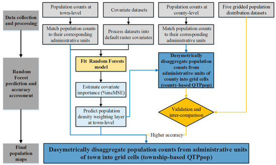 Flowchart of the disaggregation of population counts from administrative units of towns into 1 km grid cells on the QTP (modified from Stevens et al. [7]).