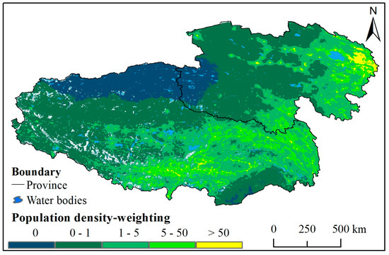 Population density weighting layer at a spatial resolution of 1 km predicted by the random forest (RF) model for the QTP in 2010.