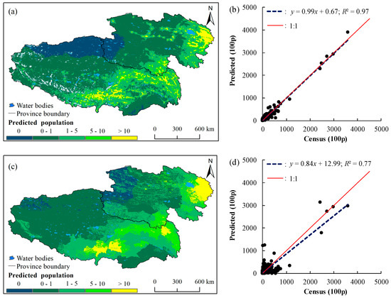 The town-based QTPpop product that was constructed in this study consisted of temporally comparable population datasets based on demographic data for 2000, 2010, and 2016 and a number of covariates that are time-invariant and temporally explicit. Compared with national population datasets (e.g., Xu et al. (2017) [43], Gaughan et al. (2016) [11], and Tan et al. (2018) [16]), we not only used variables related to built-up areas and night-light intensity to reconstruct the changes in population distribution over time, but also employed population-sensitive POIs variables (e.g., distances to temples and settlements) as predictors of population distribution in remote rural areas.