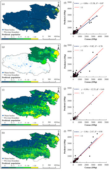 Comparison of population density maps of the QTP produced using six gridded population datasets for 2010 (a,c,e,g,i,k) and corresponding predicted population unit counts at the town-level compared to the original census counts at the same unit level (b,d,f,h,j,l). (a,b), (c,d), (e,f), (g,h), (i,j), and (k,l) represent the datasets from the county-based QTPpop, Cnpop1, Cnpop2, CnPop3, GPW v4, and WorldPop, respectively. Gridded products denote the population in people per pixel at ~1 km resolution.