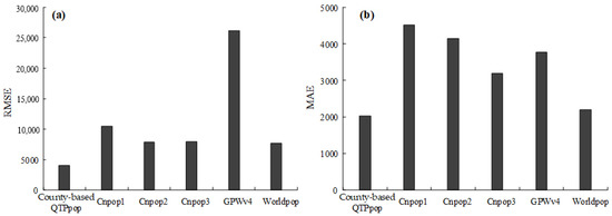 Comparison of the accuracy statistics ((a) root-mean-square error [RMSE] and (b) mean absolute error [MAE]) of six predicted population density products for 2010.