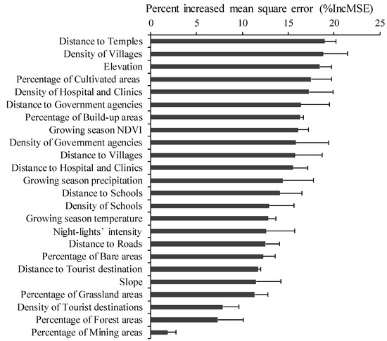 Percentage-increased mean squared errors (%IncMSE) indicating the importance of variables in explaining the population density in the RF model.