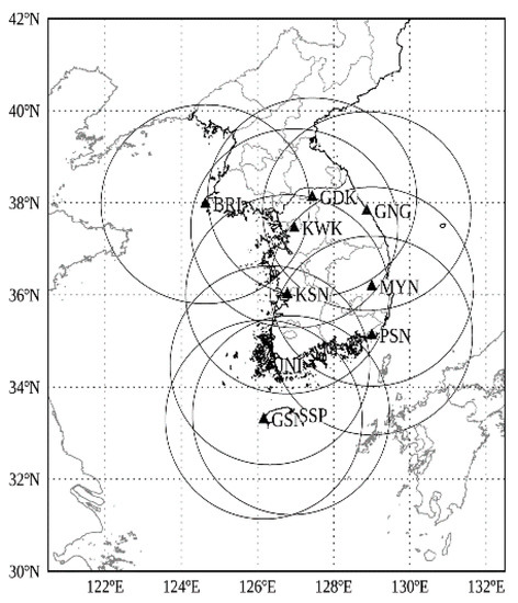 Deployment of the Korea Meteorological Administration (KMA) S-band dual-polarization weather radar network. The 10 circles indicate the 240 km radius coverage of the radar.