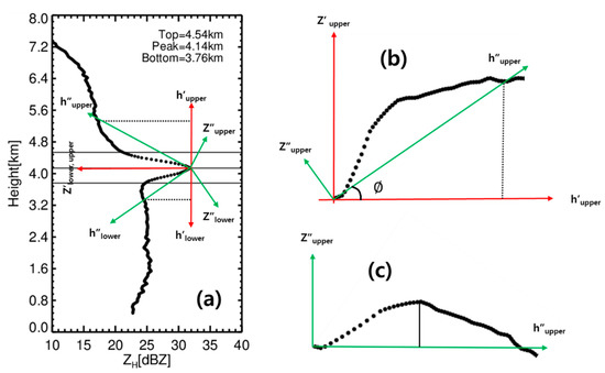 The procedures for BB detection using the QVPs of the ZH, ZDR, and new ρHV were divided into the following two steps: (1) detection of the peak of the BB (BBPEAK) and (2) detection of the top and bottom of the BB (BBTOP and BBBOTTOM) using the coordinate rotation method. BBPEAK was identified by calculating the first derivative of polarimetric observations. The first derivative was calculated from the difference in the polarimetric observations at a height of 60 m above and below a given height. BBPEAK was obtained from the maximum polarimetric observations (ZH, ZDR, and new ρHV) within a height of 400 m above and below the height at which the first gradient was at maximum. The ZH, ZDR, and new ρHV at BBPEAK should be greater than 0.0 dBZ, 0.0 dB, and 2 (=0.98), respectively. In this study, we briefly describe the coordinate rotation method. Figure 2 shows a diagram of the procedures for detecting BBTOP and BBBOTTOM from the QVP of the ZH. First, the QVP was separated by the upper and lower parts of BBPEAK relative to the line connecting BBPEAK and Z′lower, upper. The original coordinate was rotated 90° in the clockwise (counterclockwise) direction to obtain the new coordinate with h′upper−Z′ upper (h′lower−Z′lower). Then, the height of 1200 m (800 m) above (below) BBPEAK was selected to set the rotation angle . The coordinate was again rotated degrees in the clockwise (counterclockwise) direction, and h″upper (h″lower) and Z″ upper (Z″lower) are the x-axis and y-axis in the final coordinate. The maximum value in the final coordinate was defined as BBTOP (BBBOTTOM).