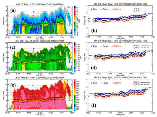 Figure 3 shows the time series of the QVPs of the ZH (top), ZDR (middle), and ρHV (bottom), and the heights of BBTOP (blue), BBPEAK (black), and BBBOTTOM (red) at an elevation angle of 15° for the BRI radar from 000 KST of 6 September 2019 to 1800 KST of 7 September 2019. In Figure 3a,c,e, the black solid line indicates BB height and the black dotted lines indicate T with a 5 °C interval (ranging from −30 to 20 °C). BBPEAK is located at the ZH maxima, ZDR maxima, and ρHV minima. BBTOP and BBBOTTOM are within a height of 500 m above and below BBPEAK. In Figure 3b,d,f, the solid and dashed lines indicate the heights where T is 0 °C and Tw is 0 °C, respectively. The height of BBTOP is closer to the zero-isotherm layer (T = 0 °C) than that of BBPEAK and BBBOTTOM.