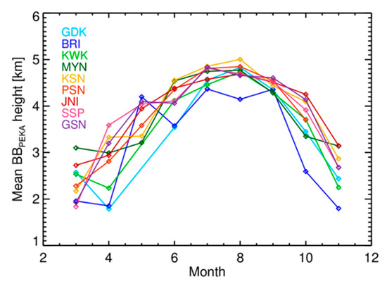 The monthly average H(ZH Peak) is shown in Figure 4 and Table 3. The cold (warm) color indicates that the radar is located at higher (lower) latitude. All H(ZH Peak) values in the warm season were higher than those in the cold season. The H(ZH Peak), which ranged from 4.14 to 4.71 km, on average, during the summer, showed an annual variation with a peak in July or August. The mean H (ZH Peak) in March, April, and November was less than 3.0 km, and that in September was greater than 4.0 km. The differences in H(ZH Peak) among radars during the cold seasons were greater than those during warm seasons. Overall, the H(ZH Peak) from radars at higher latitudes was lower than that from radar at lower latitudes. The H(ZH Peak) at the GSN and SSP radars, which are located at relatively low latitudes, reached 4 km in May, whereas those at the KWK, MYN, KSN, PSN, and JNI radars exceeded 4 km in June. The H(ZH Peak) at the BRI and GDK radars, which are located at relatively high altitudes, exceeded 4 km in July.