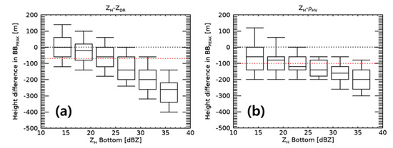 Figure 6 shows the difference between H(ZH Peak) and H(ZDR Peak) (black line), and that between H(ZH Peak) and H(ρHV Peak) (red line) as a function of ZH Bottom. The black (red) dotted line indicates no difference (the mean difference in heights shown in Figure 5). H(ZDR Peak) was almost identical to H(ZH Peak) in the range of 10 to 15 dBZ, whereas it was lower than 290 m than H(ZH Peak) in the range of 35 to 40 dBZ. However, H(ρHV Peak) differed from H(ZH Peak) by more than 60 m (200 m) in the range of 10 to 15 dBZ (35 to 40 dBZ). In summary, according to Figure 5 and Figure 6, H(ZH Peak), H(ZDR Peak), and H(ρHV Peak) did not match. The difference in heights of BBPEAK increased with increasing ZH Bottom. The larger size and higher number concentration of melting snowflakes result in more significant differences in the height of BBPEAK based on polarimetric observations.