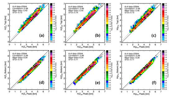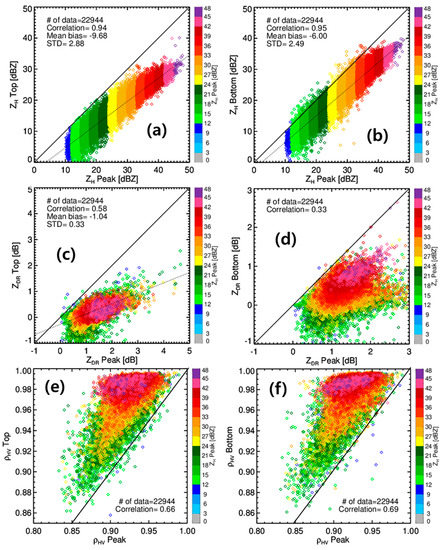 Figure 13 shows scatterplots between ZH Peak and ZH Top/ZH Bottom, ZDR Peak and ZDR Top/ZDR Bottom, and ρHV Peak and ρHV Top/ρHV Bottom. The color of the diamond symbol indicates the ZH Peak. According to [27], a high ZH in the BB represented large snowflakes enlarged via aggregation, and a low ZH mainly represented pristine ice crystals. In addition, a high number of snowflake concentrations increased the number of raindrops after passing the BB. It is apparent from Figure 13a that the mean difference between ZH Top and ZH Peak was 9.68, with a standard deviation of 2.88 dB, and the mean difference between ZH Peak and ZH Bottom was 6.00 dB with a standard deviation of 2.49 dB. Large snowflakes result in an intense BB, which leads to overestimation of rainfall at the surface. ZDR Top and ZDR Peak showed a correlation of 0.58 and a mean difference of −1.04 dB, while ZDR Peak and ZDR Bottom showed a correlation of 0.33. Large snowflakes with high ZH Bottom turn into large raindrops with high ZDR Bottom. Large snowflakes grown by aggregation (represented by high ZH Peak) turn into large raindrops (high ZDR Bottom). In other words, the size of raindrops is related to the growth process of snowflakes above the BB. The difference between ρHV Peak and ρHV Top (between ρHV Peak and ρHV Bottom) increased even more as ZH Peak increased. This results from the inhomogeneity of the hydrometeors’ shape, orientation, and size within the BB since large snowflakes melt more slowly than small snowflakes. In addition, ρHV Peak, ρHV Top, and ρHV Bottom with low ZH Bottom were similar (close to the 1:1 line). This mean that the ρHV shows no distinctive signature for a weak BB.