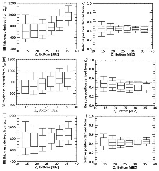 Figure 8 shows box plots of the BB’s thickness (left) and r (right) according to ZH Bottom at intervals of 5 dB. For the ZH and ZDR, the thicknesses of the BB increased with increasing ZH Bottom. The weak ZH in the BB represents non-aggregated snowflakes that are small in size. On the one hand, small snowflakes melt quickly and result in a thin BB. On the other hand, heavily aggregated snowflakes cause a thick and strong BB due to the fact that they need more time to completely melt than small particles. Interestingly, the BB thickness slowly increased until 20 dBZ, and rapidly increased above 20 dBZ, as shown in [34]. The BB thickness estimated using the ZH and ZDR exceeded 980 m and 870 m in the 35–40 dBZ range of ZH Bottom. The BB thickness estimated using ρHV was 800 m in the 10–15 dBZ range of ZH Bottom and 875 m in the 35–40 dBZ range of ZH Bottom. The ρHV related to the diversity of hydrometeors had a relatively constant thickness regardless of ZH at BBBOTTOM and a smaller variation as compared with the ZH and ZDR. The r was 0.45 for the ZH and ρHV regardless of ZH Bottom, and BBPEAK was closer to BBBOTTOM than BBTOP. The r of the ZDR decreased from 0.5 to 0.4 as ZH Bottom increased from the range of 10–15 dBZ to 35–40 dBZ. The non-symmetric structure of the ZDR resulted from a rapid decrease in the ZDR, due to the break-up of large melted particles at the final state of melting process [34].