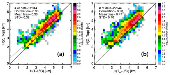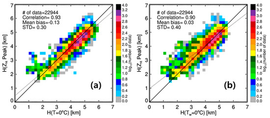 Two-dimensional frequency distributions between (a) H(ZH Peak) and H(T = 0 °C) and between (b) H(ZH Peak) and H(Tw = 0 °C).