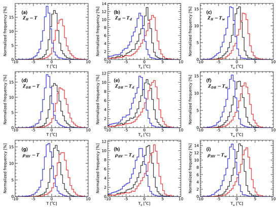 Normalized frequency distribution of (a,d,g) T, (b,e,h) Td, and (c,f,i) Tw at top (blue), peak (black), and bottom (red) of bright band from QVPs of (a–c) ZH, (d–f) ZDR, and (g–i) ρHV.