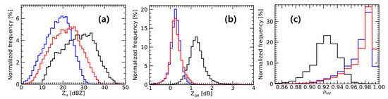 Normalized frequency distribution of (a) ZH, (b) ZDR, and (c) ρHV at top (blue), peak (black), and bottom (red) of the BB.
