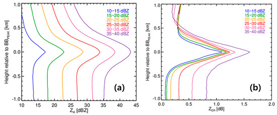 Mean profile of the (a) ZH and (b) ZDR with respect to the height relative to BBPEAK at the ZH Bottom classes with 5 dBZ intervals.