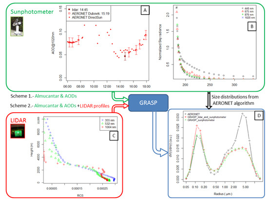 - Chaikovsky, A.; Dubovik, O.; Holben, B.; Bril, A.; Goloub, P.; Tanré, D.; Pappalardo, G.; Wandinger, U.; Chaikovskaya, L.; Denisov, S.; et al. Lidar-Radiometer Inversion Code (LIRIC) for the retrieval of vertical aerosol properties from combined lidar/radiometer data: Development and distribution in EARLINET. Atmos. Meas. Tech. 2016, 9. [Google Scholar] [CrossRef]