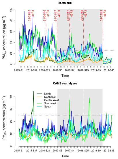 The CAMS reanalysis data, provided on an ∼80 km spatial resolution regular grid, were used to describe and discuss the surface PM concentration distributions from 2015 to 2019 in Brazil. The CAMS reanalysis system retrospectively applies the last improvements in the models and observations to provide reference and homogeneous data on atmosphere composition over a long past period [33], whereas NRT forecasts are impacted at each IFS upgrade implementation (Figure 1). Reanalysis data were accessed using the Copernicus Atmosphere Data Store.