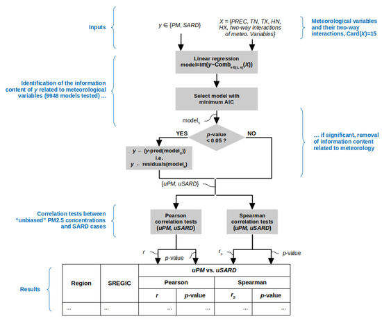 To consider the confounding effects of the meteorological conditions, the part of the variance (information) of the PM and SARD variables that was explained by meteorological conditions was previously removed from the two variables. The PM and SARD variables were considered separately, and for each SREGIC, the best multivariate linear regression model, in terms of the minimum Akaike information criterion (AIC), was selected by considering all combinations of 1 to 6 explanatory variables. The set of explanatory variables was composed of the 5 meteorological variables and their 10 possible two-way interactions (which corresponds to models tested for each SREGIC). Then, for each SREGIC, the Pearson and Spearman correlation coefficients, to account for linear (Pearson correlation) and nonlinear (rank-based association detected by Spearman correlation) relationships, were computed between the residuals of the best models found for the PM and SARD variables, referred to as uPM and uSARD, respectively. The procedure is schematically presented Figure 2.