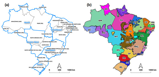 (a) Brazil states and regions; (b) regions of Influence of cities (REGIC, source: Brazilian Institute of Geography and Statistics (IBGE)) aggregated per state (statewide REGIC (SREGIC)). AC: Acre; AP: Amapá; AM: Amazonas; PA: Pará; RO: Rondônia; RR: Roraima; TO: Tocantins; AL: Alagoas; BA: Bahia; CE: Ceará; MA: Maranhão; PB: Paraíba; PE: Pernambuco; PI: Piauí; RN: Rio Grande do Norte; SE: Sergipe; DF: Distrito Federal; GO: Goiás; MT: Mato Grosso; MS: Mato Grosso do Sul; ES: Espírito Santo; MG: Minas Gerais; RJ: Rio de Janeiro; SP: São Paulo; PR: Paraná; RS: Rio Grande do Sul; SC: Santa Catarina.