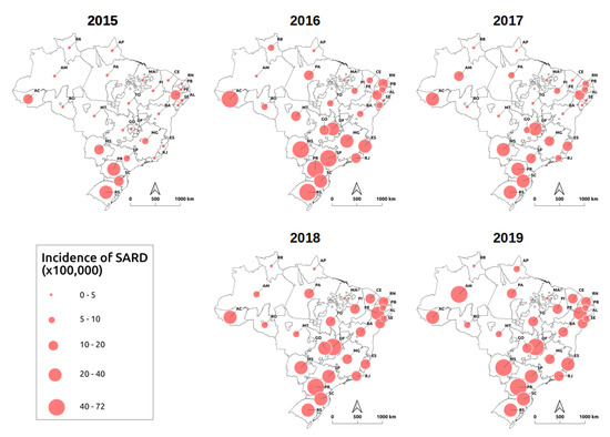 The South region was the one the most affected by SARD during the period 2015–2019, with relatively high annual incidence rates (Figure 5).
