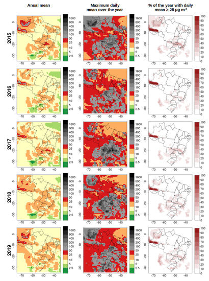 Mapping PM concentrations provided by the CAMS reanalysis dataset shows that more than half of the country was exposed to annual mean concentrations of PM that exceeded the WHO AQG (10 g m (Figure 6, left column). High PM concentrations were predicted all year long and for all the considered years in a strip located in the South of the Amazonas state at the border with Acre. In this region, concentrations significantly exceeded 50 g m in some places (five times the WHO AQG). A region associated with high concentrations was also observed in a west–east-oriented strip crossing the Center West and Southeast regions. The states of Amapá, Pará (to the north), Maranhão, Rondônia, Mato Grosso (central), and Bahia (west part) seemed to be the least exposed to high annual mean concentrations, whereas very large states like Amazonas, Pará, Mato Grosso, and Bahia were exposed to heterogeneous levels of PM concentrations in space.