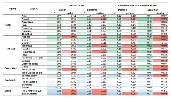 Particulate matter concentrations and SARD cases corrected for the confounding effects of the meteorological conditions, i.e., uPM and uSARD, respectively, were positively correlated in all SREGICs of the Center West, Northeast, and North regions, with the exception of the SREGIC of Rio Grande do Norte, which exhibited a nonsignificant negative correlation (Figure 7 and Figure 8; to visualize corrected variables for each SREGIC, see Appendix H and Appendix I). Significant (p-value < 0.05) positive correlations were obtained for the SREGICs of Amapá, Alagoas, Bahia, Maranhão, Pernambouco, and Mato Grosso, with correlation coefficients varying from 0.24 (Mato Grosso) to 0.35 (Maranhão) considering the maximum of the Pearson and Spearman coefficients (Figure 7 and Figure 8). Correlations were improved by first smoothing the uPM and uSARD variables with a three-week centered moving average. Half of the SREGICs belonging to the previously mentioned regions were associated with a significant correlation coefficient (reaching 0.52 for Maranhão, p-value < 0.01), the others being associated with positive but nonsignificant positive correlations, except for the SREGIC of Rio Grande do Norte, which was still associated with a nonsignificant negative correlation. The majority of the SREGICs that presented significant correlations were situated in a west–east-oriented strip from Mato Grosso to the south of the Northeast region, which coincides with exposures to relatively high PM concentrations (Figure 6) and with high SARD incidences (Figure 5).