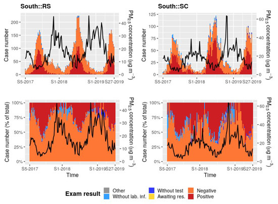 In the SREGICs of Rio Grande do Sul and Santa Catarina, PM concentrations and SARD cases presented a strong seasonality and a clearly opposite dynamic (Figure 9). However, a clear association was observed between the PM concentrations and the negative test proportion in these two SREGICs (Figure 9).