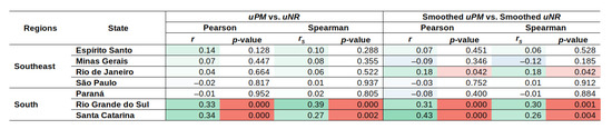 where and are the number of negative and positive tests for viral infection by epidemiological week, respectively. By applying the same procedure to remove the information attributable to meteorological conditions, uNR and the correlation coefficients between uNR and uPM were computed. The results showed a tendency to positive correlations for the SREGICs of the South and Southeast regions (Figure 10). Correlations were very significant for three SREGICs: Rio de Janeiro, Rio Grande do Sul, and Santa Catarina.
